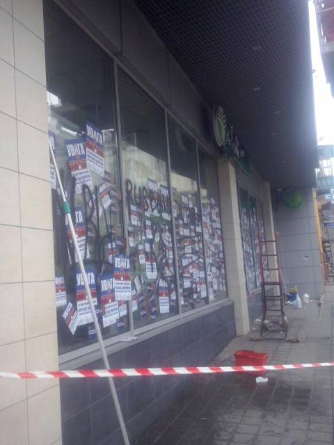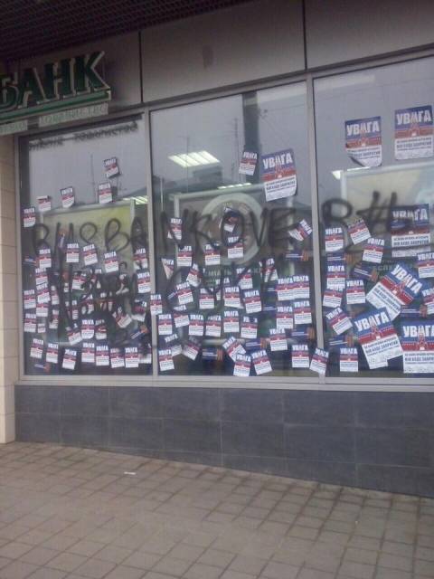Сьогодні, близько 14:00 год., невідомі облеїли наліпками та розмалювали фасад філії банку "Сбербанк", що на проспекті Чорновола, 2б.