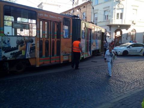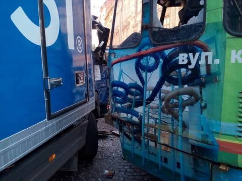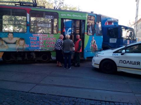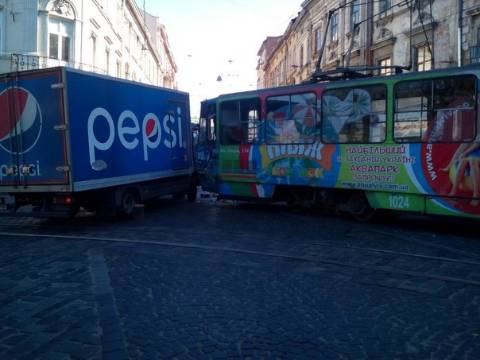 Сьогодні вранці на площі Соборній трамвай №1 зіткнувся з вантажівкою. У зв'язку з ДТП рух на площі ускладнено.