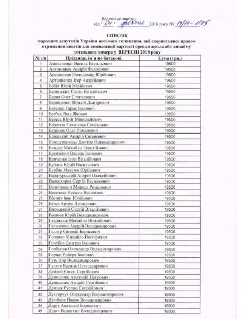Відтак, у вересні 2018 року 171 народний депутат отримав кошти для компенсації вартості оренди житла чи готельного номера. Додамо, що у серпні цього року їх було 172.