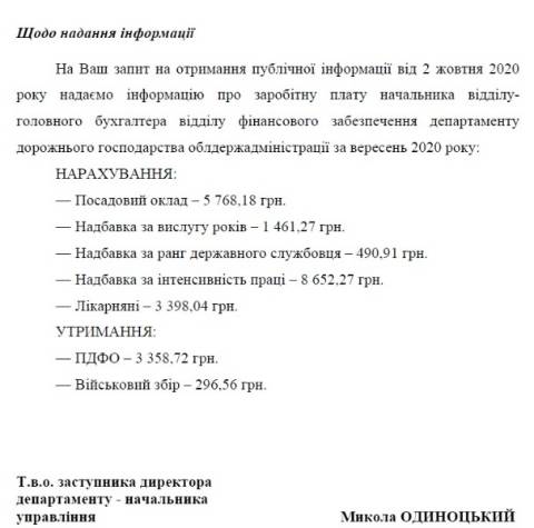 У вересні головній бухгалтерці департаменту дорожнього господарства нарахували 19 тис грн зарплати.