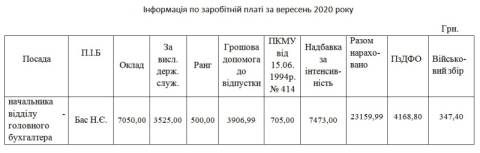 Із цих коштів Бас сплатила 4 168,80 грн податку з доходів фізичних осіб та 347,40 грн військового збору. Відтак, фактично виплачена заробітна плата чиновниці за вересень цього року без податків, зборів та перерахувань становила 18 643,79 грн.