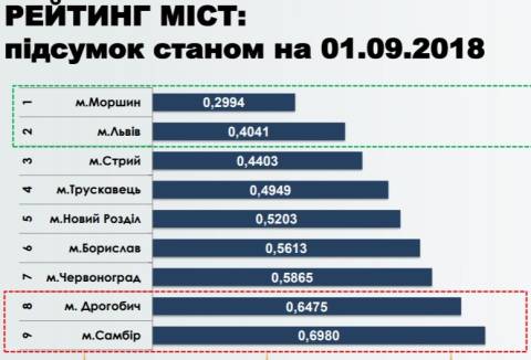 Серед міст обласного значення рейтинг очолює Моршин та Львів, останні місця посіли Дрогобич та Самбір.