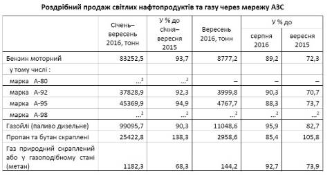 Відтак, дизельного палива дизельного продали 99,1 тис.т, що на 9,7% менше, ніж у січні-вересні 2015 року, бензину моторного – 83,3 тис.т (на 6,3% менше), пропану і бутану скраплених – 25,4 тис.т (на 38,3% більше).