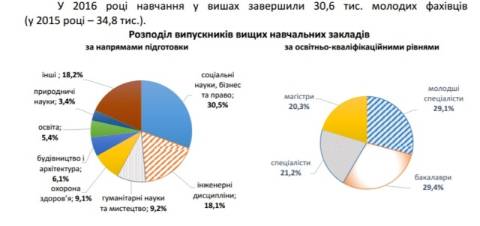 Дипломованими спеціалістами стали − 6,5 тис. випускників, магістрами – 6,2 тис. , бакалаврами − 9,0 тис., молодшими спеціалістами − 8,9 тис. Найбільша кількість випускників здобули вищу освіту в галузі соціальних наук, бізнесу і права – 9,4 тис., з інженерних дисциплін − 5,6 тис., з гуманітарних наук та мистецтва – 2,8 тис., стільки ж у галузі охорони здоров’я.