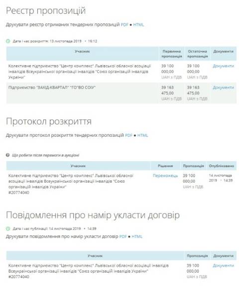 Аукціон стартував 6 листопада цього року, участь у ньому взяли колективне підприємство "Центр комплекс" Львівської обласної асоціації інвалідів Всеукраїнської організації інвалідів "Союз організацій інвалідів України" та підприємство "Захід-квартал" "ГО"ВО СОІУ", які запропонували здійснити всі роботи за 39 100 000 грн й 39 163 475 грн відповідно. Переможцем обрали "Союз організацій інвалідів України".