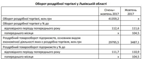 Зокрема, у січні-жовтні 2017 року обсяг обороту роздрібної торгівлі збільшився, порівняно із січнем-жовтнем 2016 року на 12,4% і становив 41,4 млрд грн.