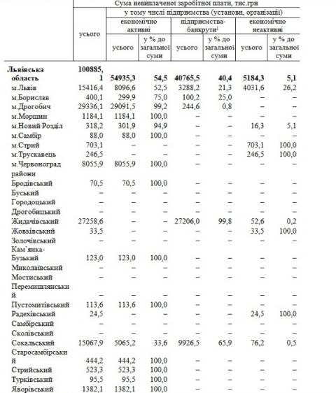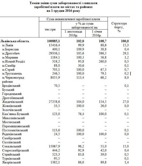 Відтак, станом на 1 грудня 2016 року на заборгованість із виплати заробітної плати на Львівщині становила 100 885,1 тис грн.
