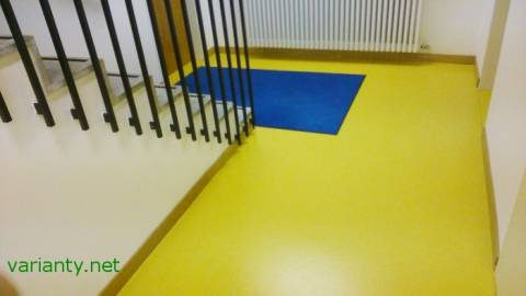 У приміщенні жовтогаряча підлога та сині килимки. Ярослава Мельник каже, що такою була задумка архітектора, який вважав, що таке поєднання кольорів зробить приміщення "теплішим".