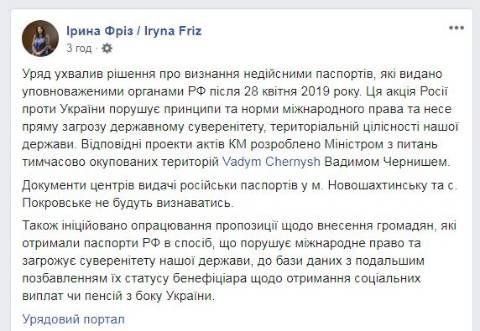 "Ініційовано опрацювання пропозиції щодо внесення громадян, які отримали паспорти РФ в спосіб, що порушує міжнародне право та загрожує суверенітету нашої держави, до бази даних з подальшим позбавленням їх статусу бенефіціара щодо отримання соціальних виплат чи пенсій з боку України" –написала Ірина Фріз.