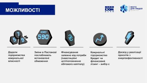 Укрексімбанк також ефективно працює за державною програмою кредитування 5-7-9, яку у березні постановою Уряду поширили на комунальні підприємства. Він став першим українським банком, який надав кредит комунальному підприємству за цією програмою. Доступ до цієї програми для комунальних підприємств розв'язує актуальні проблеми невеликих громад і допомагає їм ставати спроможними та стійкими. Наразі банку є 65 заявок на отримання кредиту за цією програмою.