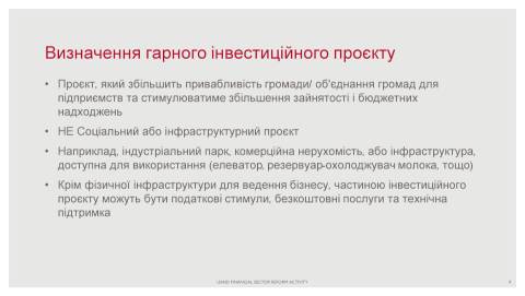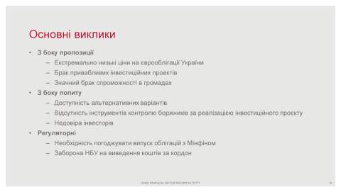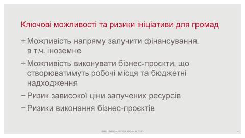 Громадам також вигідно користатись кредитами та іншими формами фінансових позичок під час реалізації масштабних проєктів розвитку. Втім, сьогодні співпраця гальмується застарілими стереотипами, браком знань та досвіту з боку менеджерів громад.