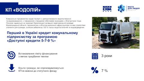 "Це надзвичайно символічно, що Укрексімбанк став банком, який надав перший кредит в Україні комунальному підприємству за державною програмою "5-7-9%". Адже існує стереотип, що великі банки пропонують кредити лише великому бізнесу та містам-мільйонникам. Після реформи децентралізації навіть малі громади демонструють свою фінансову спроможність, а тому збитковість деяких комунальних підприємств або медичних закладів більше не відлякує банки. Від органів місцевої влади важливо лише підтвердити своїм рішенням, що вони акцептують проєкт, дозволяють взяти кредит і, за потреби, передбачають використання бюджету розвитку як джерело погашення кредиту", – зазначив член Правління Укрексімбанку Михайло Медко.