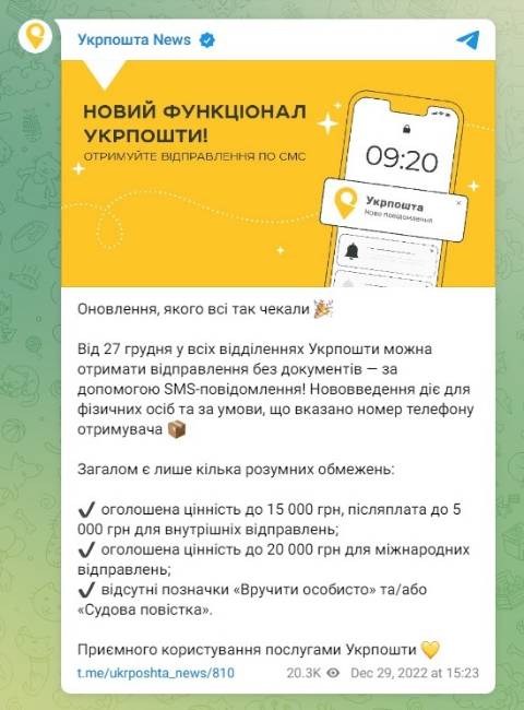 "Від 27 грудня у всіх відділеннях Укрпошти можна отримати відправлення без документів – за допомогою SMS-повідомлення! Нововведення діє для фізичних осіб та за умови, що вказано номер телефону отримувача" – йдеться в повідомленні.