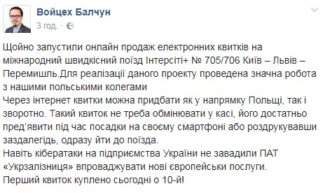 "Через Інтернет квитки можна придбати як у напрямку Польщі, так і зворотно. Такий квиток не треба обмінювати у касі, його достатньо пред’явити під час посадки на своєму смартфоні або роздрукувавши заздалегідь, одразу йти до поїзда", – зазначив Войцех Бальчун.