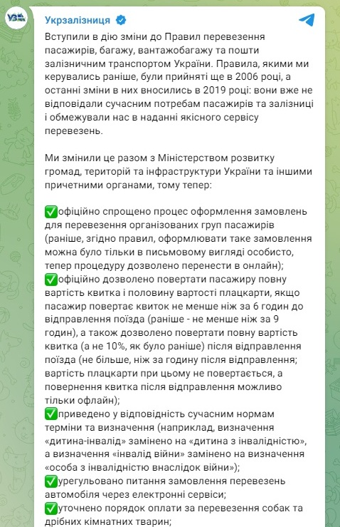 У суботу, 25 березня, вступили в дію зміни до правил перевезення пасажирів, багажу, вантажобагажу та пошти залізничним транспортом України, згідно з якими Укрзалізниця дозволила повертати квитки на потяги вже після відправлення.