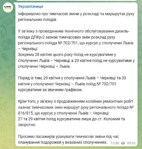 Крім того, у зв'язку з продовженням колійних ремонтних робіт зазнає тимчасових змін маршрут руху регіонального поїзда № 816/815, що курсує у сполученні Львів – Чернівці: 27 та 29 квітня поїзд курсуватиме лише до ст. Коломия та зворотно.