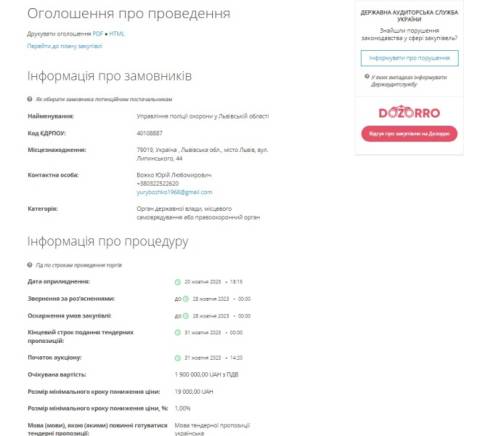 Аукціон стартує 31 жовтня, а очікувана вартість послуг становить 1 900 000 грн.