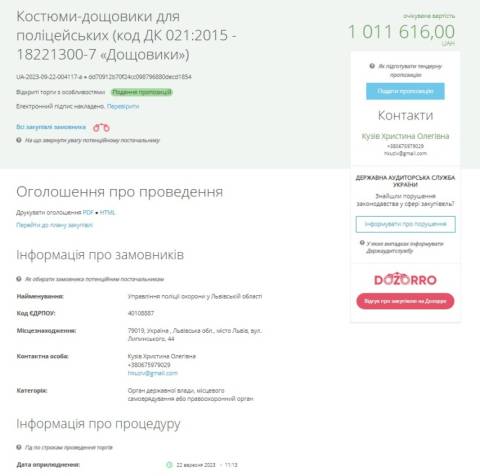 Зазначимо, за один такий костюм-дощовик управління поліції охорони Львівщини готове заплатити понад 2,2 тис. грн.