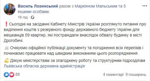 Вчора, 18 грудня, на засіданні кабмін погодив виділити кошти для дрогобиччан, які втратили житло внаслідок обвалу будинку.