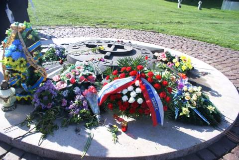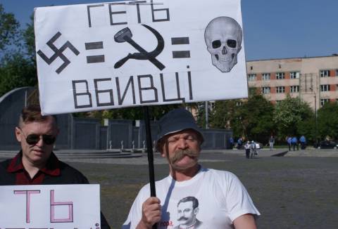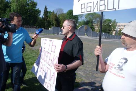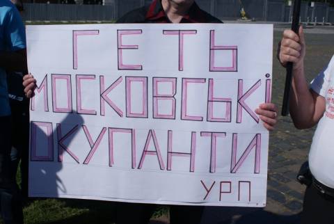 Сьогодні на Марсовому полі двічі розгорнули червоні прапори, а також двоє чоловік, за їхніми словами, з власної ініціативи принесли плакати "Геть московські окупанти" та "Геть вбивці". Щоправда, на одному з плакатів у кутку було написано - УРП.