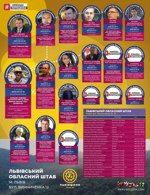 За офіційними даними, Львівський обласний штаб Блоку Петра Порошенка очолює голова Львівської ОДА Олег Синютка, а першим заступником є політтехнолог, завідувач кафедри політології ЛНУ ім. Франка Анатолій Романюк. Він є начальником рідного брата екс-керівника цієї фракції у парламенті нардепа Ігоря Гриніва Юрія Гриніва.