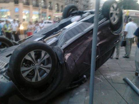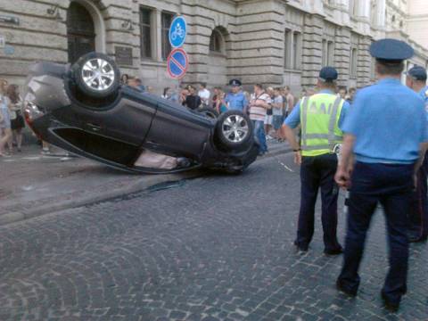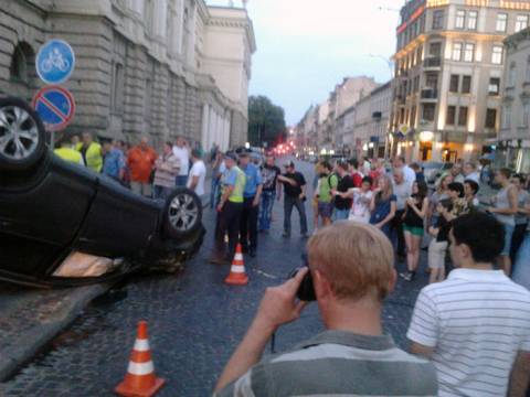 Після зіткнення, автомобіль Honda перекинувся та зніс світлофор на тротуарі біля Оперного театру.