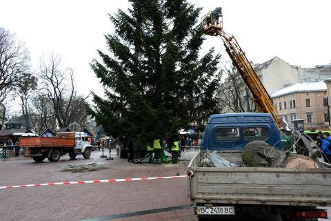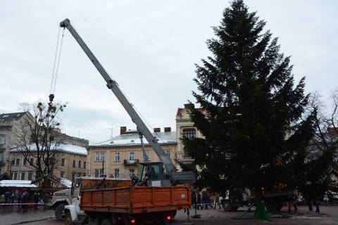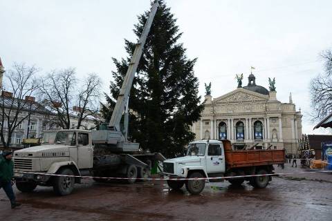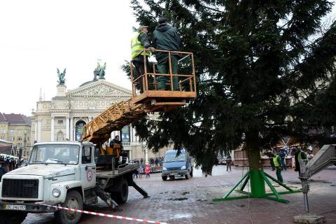 Сьогодні, близько 15:30 год., на площі перед Оперним театром почали встановлювати головну ялинку Львова.