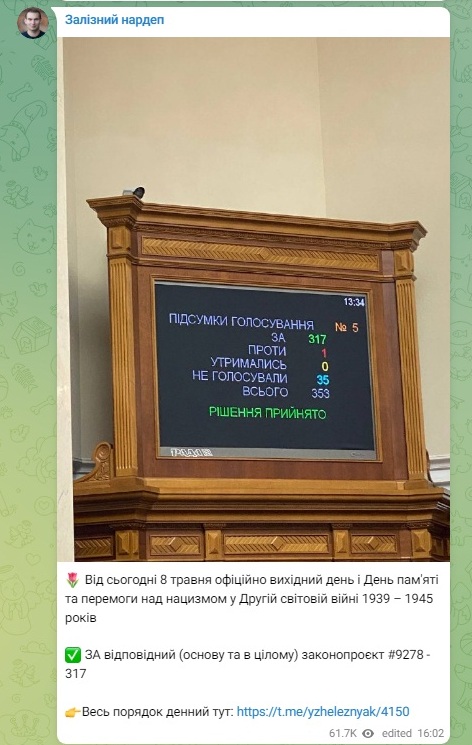 Вчора, 29 травня, Верховна Рада України прийняла законопроєкт №9278, яким 8 травня в Україні встановлюється Днем пам'яті та перемоги над нацизмом й цей день буде вихідним.