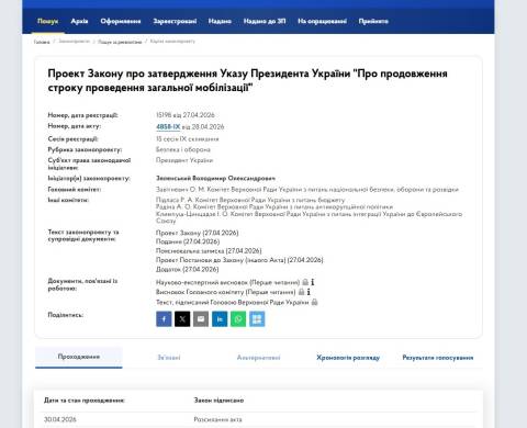Згідно із законопроєктами, продовжили дію воєнного стану в Україні та загальної мобілізації на 90 днів – з 4 травня цього року до 2 серпня.