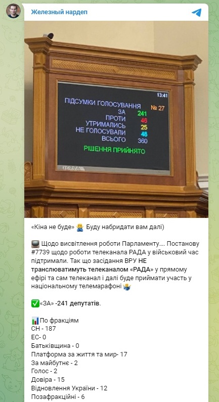 "Постанову №7739 щодо роботи телеканалу "Рада" у воєнний час підтримали. Так що засідання ВРУ не транслюватимуть телеканалом "Рада" у прямому ефірі та сам телеканал і далі буде брати участь у національному телемарафоні" – наголосив Железняк.
