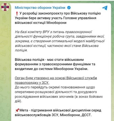 "Військова поліція – має стати військовим формуванням з правоохоронними функціями та входитиме до системи Міноборони України. Орган буде утворено на основі Військової служби правопорядку у ЗСУ. До нього перейдуть окремі повноваження щодо оперативно-розшукової діяльності та досудового розслідування військових злочинів (в зонах бойових дій)" – йдеться у повідомленні.