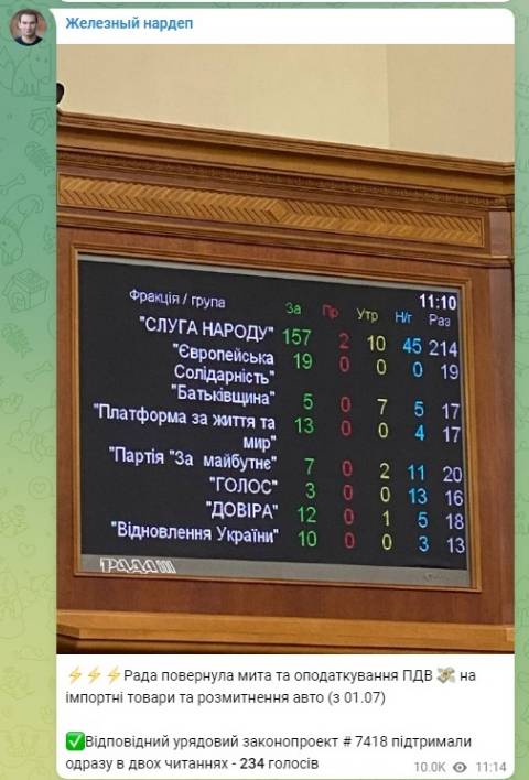 Зазначимо, законопроєкт №7418 містить поправки до Податкового кодексу та інших законів про повернення всіх мит та ПДВ на імпортні товари, зокрема на автомобілі. Він також пропонує відновити оподаткування, яке було скасоване у березні цього року, для товарів, які ввозять платники єдиного податку першої-третьої групи, оскільки в середньому за місяць бюджет за цією пільгою втрачає близько 3 млрд грн ввізного мита.