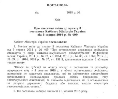 Для стимулювання населення до встановлення лічильників Кабмін з 1 жовтня скасовує пільги та субсидії на оплату послуг з постачання та розподілу природного газу в раніше встановлених обсягах соціальних нормативів. Це поширюється на споживачів, які не встановили лічильники за рахунок державного/місцевого бюджетів або власних коштів операторів газорозподільчих систем.