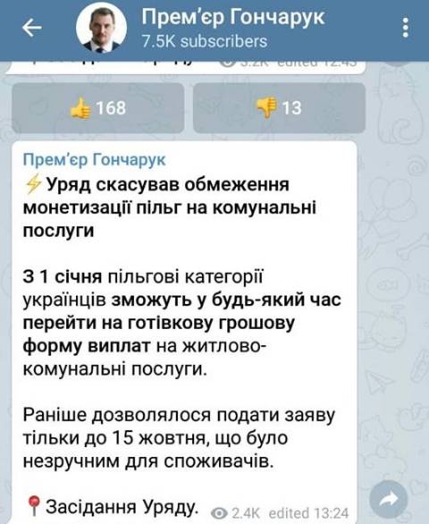 Про це повідомив Прем'єр-міністр України Олексій Гончарук на своєму Телеграм-каналі.
