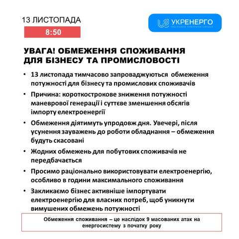 "13 листопада тимчасово запроваджуються обмеження потужності для бізнесу та промислових споживачів через короткострокове зниження потужності маневрової генерації і суттєве зменшення обсягів імпорту електроенергії. Обмеження діятимуть упродовж дня. Увечері, після усунення зауважень до роботи обладнання – обмеження будуть скасовані" – йдеться у повідомленні.
