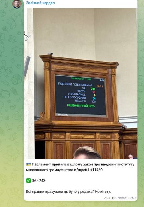 Сьогодні, 18 червня, Верховна Рада прийняла законопроєкт № 11469 "Про внесення змін до деяких законів України щодо забезпечення реалізації права на набуття та збереження громадянства України", згідно з яким в Україні вводиться інститут множинного громадянства.