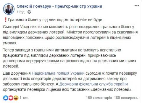 "Уряд виключив можливість розповсюдження грального бізнесу під виглядом державних лотерей. Міністри проголосували за скасування відповідних положень щодо розповсюджувачів лотерей в ліцензійних умовах", – зазначив Гончарук.
