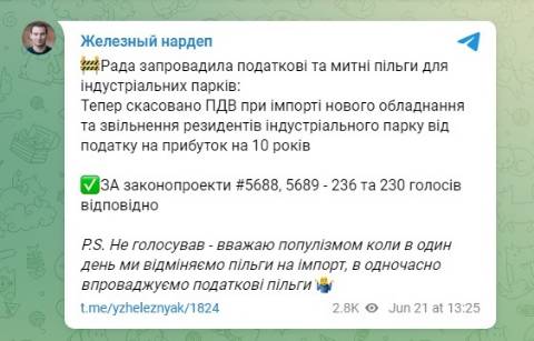 "Рада запровадила податкові та митні пільги для індустріальних парків. Тепер скасовано ПДВ при імпорті нового обладнання та звільнення резидентів індустріального парку від податку на прибуток на 10 років" – написав Железняк.