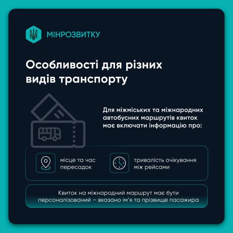 Для міжміських автобусних маршрутів квиток має містити повну інформацію про рейс: місце та час пересадок, тривалість очікування між рейсами.