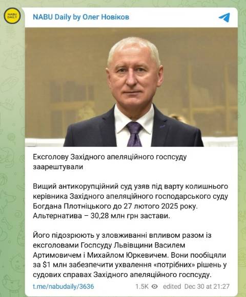 Зазначимо, 26 грудня НАБУ і САП повідомили Плотніцькому, який очолив Західний апеляційний господарський суд у 2018 році, про підозру у вимаганні хабаря.