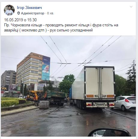 "Пр. Чорновола кільце - проводять ремонт кільця і фура стоїть на аварійці ( можливо дтп ) - рух сильно ускладнений" – йдеться у повідомленні.