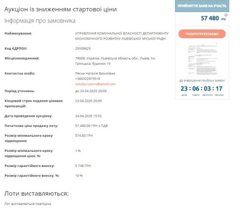Початкова ціна приміщення, виставленого на аукціон, який мав відбутися 31 березня, становила 114 960 грн, однак її зменшили до 57 480 грн, оскільки згідно з закону України про приватизацію комунального майна, на повторний продаж об'єкт виставляється зі знижкою у 50%.