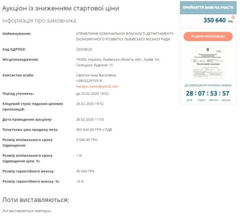 Початкова ціна приміщення, виставленого на аукціон, який мав відбутися 28 січня, становила 701 280 грн, однак її зменшили до 350 640 грн, оскільки згідно з закону України про приватизацію комунального майна, на повторний продаж об'єкт виставляється зі знижкою у 50%.