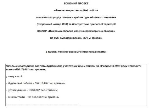 Згідно із проєктом, загальна вартість усіх робіт, станом на 22 вересня 2023 року, становить 636 171 461 грн й складатиметься із таких витрат: