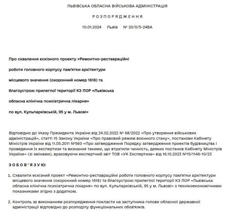 Максим Козицький погодив ескізний проєкт з ремонтно-реставраційних робіт головного корпусу пам’ятки архітектури місцевого значення та благоустрою прилеглої території КЗ ЛОР "Львівська обласна клінічна психіатрична лікарня", що на вул. Кульпарківській, 95 у Львові, враховуючи експертний звіт ТОВ "УК Експертиза" від 16 жовтня 2023 року.