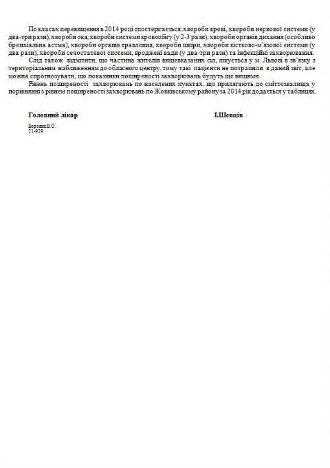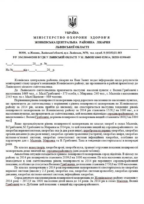 "Якщо проаналізувати рівень поширеності захворювань по класах хвороб в селах Малехів, В.Грибовичі, М. Грибовичі та Збиранка за 2014 рік, то цей показник вищий від середньорайоннного по хворобах нервової системи, хворобах ока (в два рази вище), цереброваскулярних хворобах, хворобах органів дихання (в два рази вище), хворобах органів травлення (гастрити), хворобах шкіри, хворобах кістково-м’язової системи, хворобах сечостатевої системи інфекційних хворобах, особливо це характерно для с. Малехів, Збиранка та В. Грибовичі. Така ж тенденція спостерігалась і в попередні роки", – йдеться у повідомленні Жовківської лікарні.