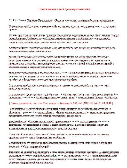 Відтак, було запропоновано внести зміни до Ст. 35-1 Закону України "Про відходи" "Вимоги щодо поводження з побутовими відходами". Зокрема, заборонити проектування, будівництво та експлуатацію полігонів побутових відходів без оснащення системами захисту грунтових вод, вилучення та знешкодження біогазу та фільтрату.
