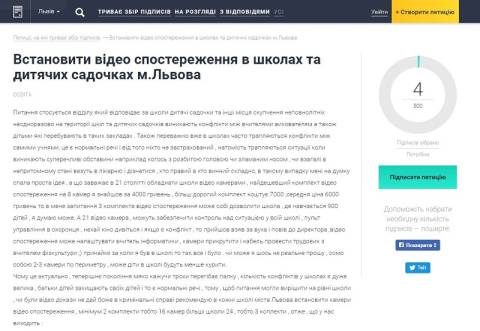 "Якщо дана петиція набере 500 голосів, то Львівська міськрада закупить 150-200 комплектів відео спостереження і передасть у всі школи Львова. Або можна піти більш радикальним способом і забов'язати всіх директорів шкіл встановити мінімум по 2-3 комплекта відео спостереження з цілодобовим записом мінімум в 48-100 годин" – пише автор петиції.