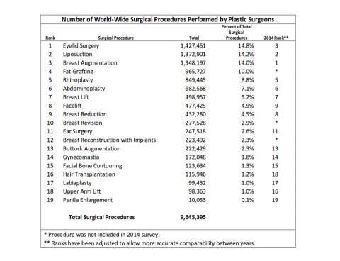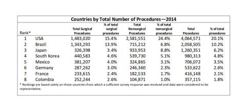 14 серпня українська преса стисло написала про черговий звіт, який за результатами 2014 року підготувало Міжнародне товариство естетичної пластичної хірургії. З документа випливає, що торік у світі провели понад 20 мільйонів хірургічних та не хірургічних косметичних процедур, а лідерами рейтингу стали США, Бразилія та Японія.