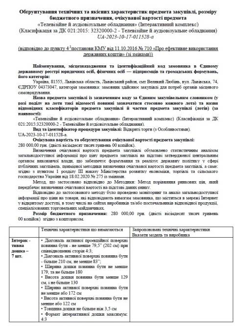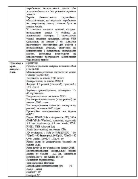 Згідно з закупівлею, Великолюбінська селищна рада замовила 7 інтерактивних дошок (ширина дошки повинна бути 179-180 см, а висота – 129-130 см) та 5 проєкторів з кріпленням потужністю не менше 203 Вт.
